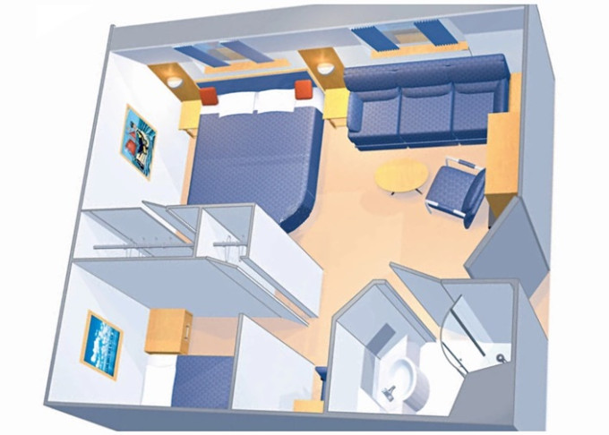 | VP - Ocean View Panoramic Suite (bez balkónu) 37 m². Panoramatické neotvárateľné okná. Oddelená časť s poschodovou posteľou. Max 6 osôb. Výhody Suite. | 2 973 € 991 € za osobu |